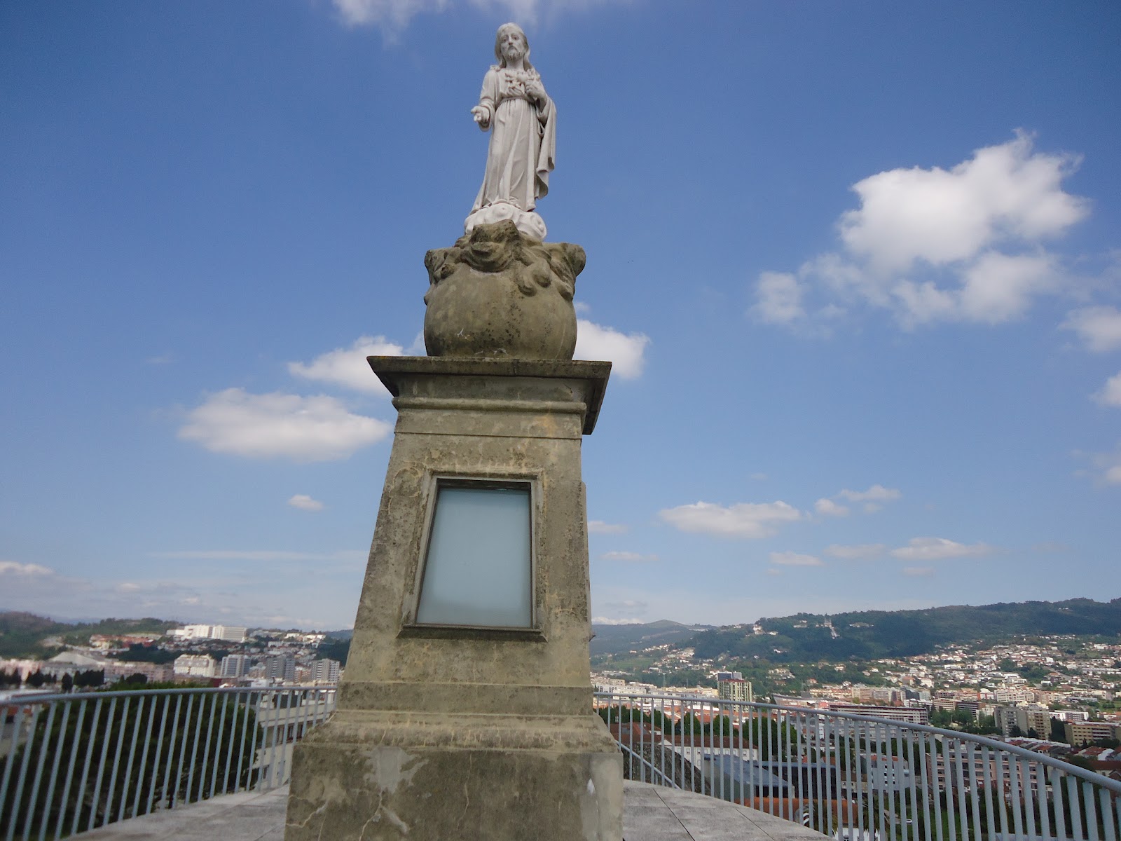 sagrado coração de jesus , a photo by cochinilha on Flickr. "Num morro sobranceiro ao seminário (o chamado monte de S.tª Margarida, com entrada pela velha e pobre rua do Sardoal, situa-se a capela de N. S.ª de Guadalupe (a 200 m de altitude), excelente miradouro da cidade. Em ponto mais alto ainda está, a norte, o miradouro do Depósito das Águas, de abastecimento do público da cidade. A água, elevada directamente da central do Cávado, por uma conduta de 300 mm (de 6 km de extensão) é aí arejada e aí distribuída. O acesso é mais árduo, mas a vista é ampla e circular. Mas esta volta (insista-se) apenas convirá a quem tiver boas pernas e um certo espírito experimental. Ao visitante de hoje, tão fatigável, será antes aconselhável somente a visita do que é comodamente acessível. Pressupondo que o leitor é dos primeiros, que ele desça do pequeno santuário pela escadaria (encardida e banal) da rua de Guadalupe. No fim desta, ao fundo, encontrará a trivial e pequena Praça de Mouzin...